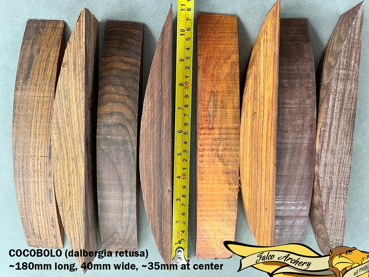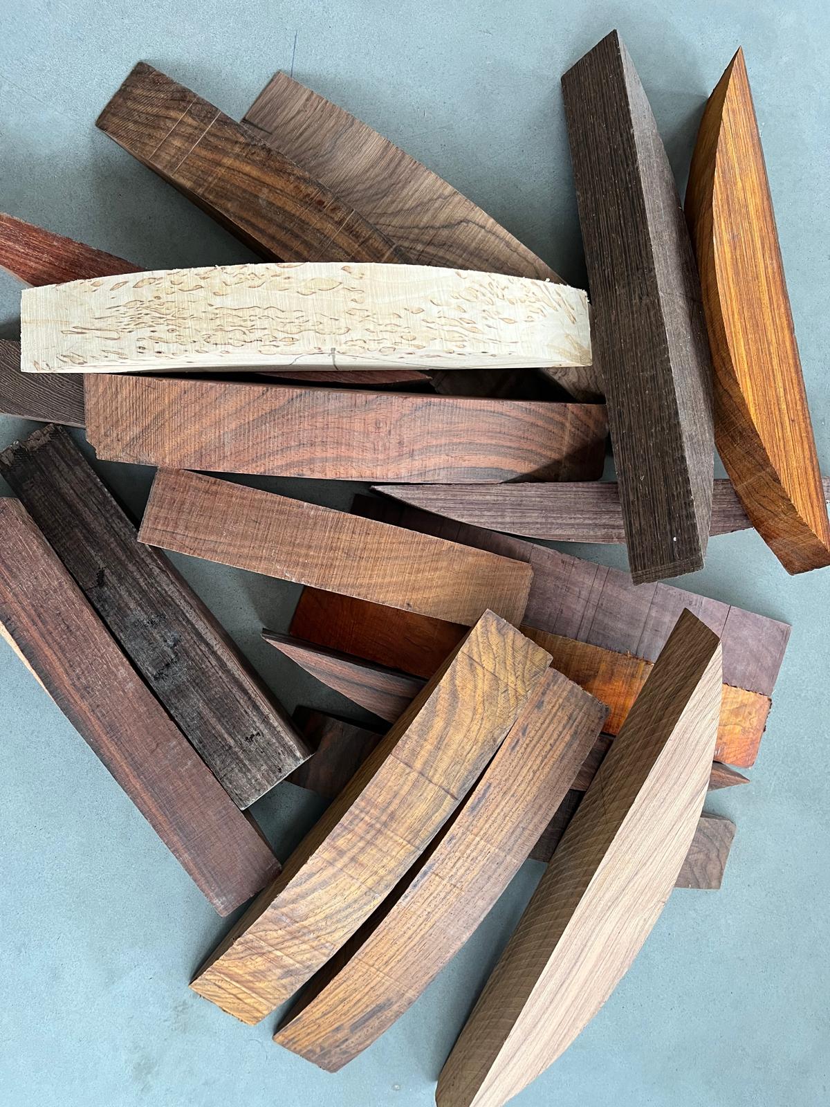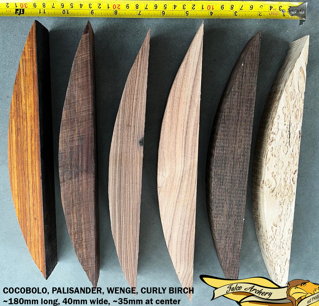 We offer pieces with one curved side of ~180mm x 40mm x ~35mm (at widest point) from high-end wood species like cocobolo (in a variety of tones), palisander, wenge, curly birch, zebrano, padauk, bocote, purpleheart, yellowheart and lacewood.